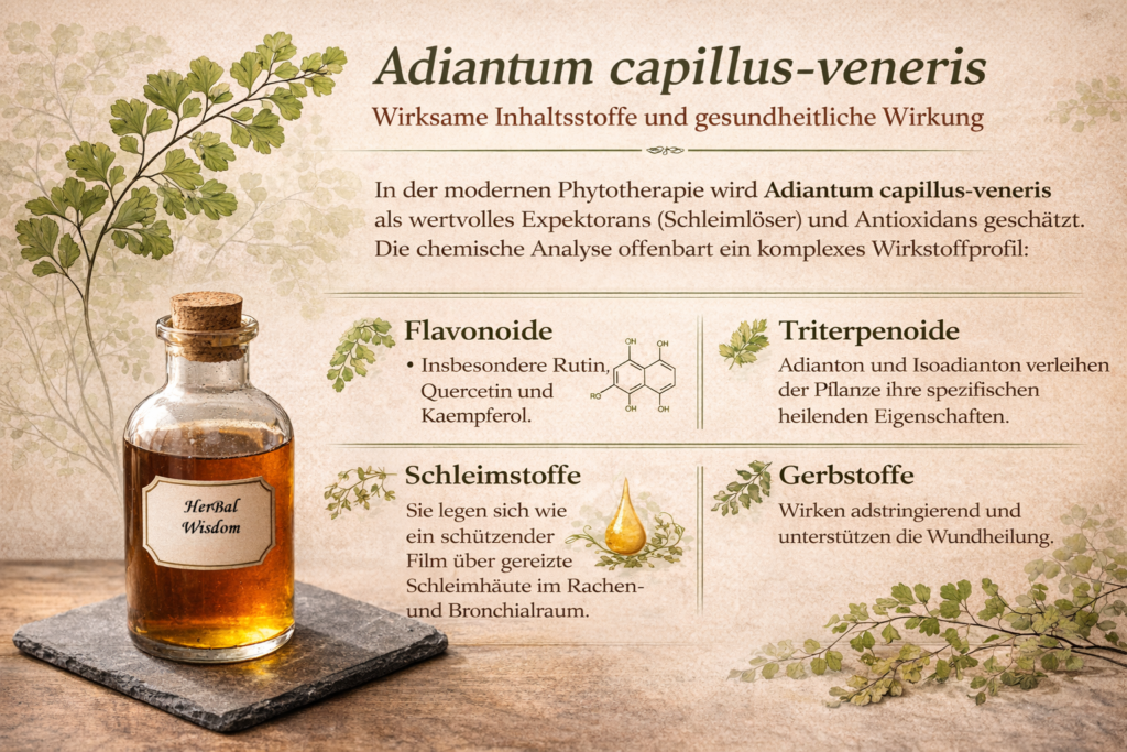 In der modernen Phytotherapie wird Adiantum capillus-veneris als wertvolles Expektorans (Schleimlöser) und Antioxidans geschätzt. Die chemische Analyse offenbart ein komplexes Wirkstoffprofil: