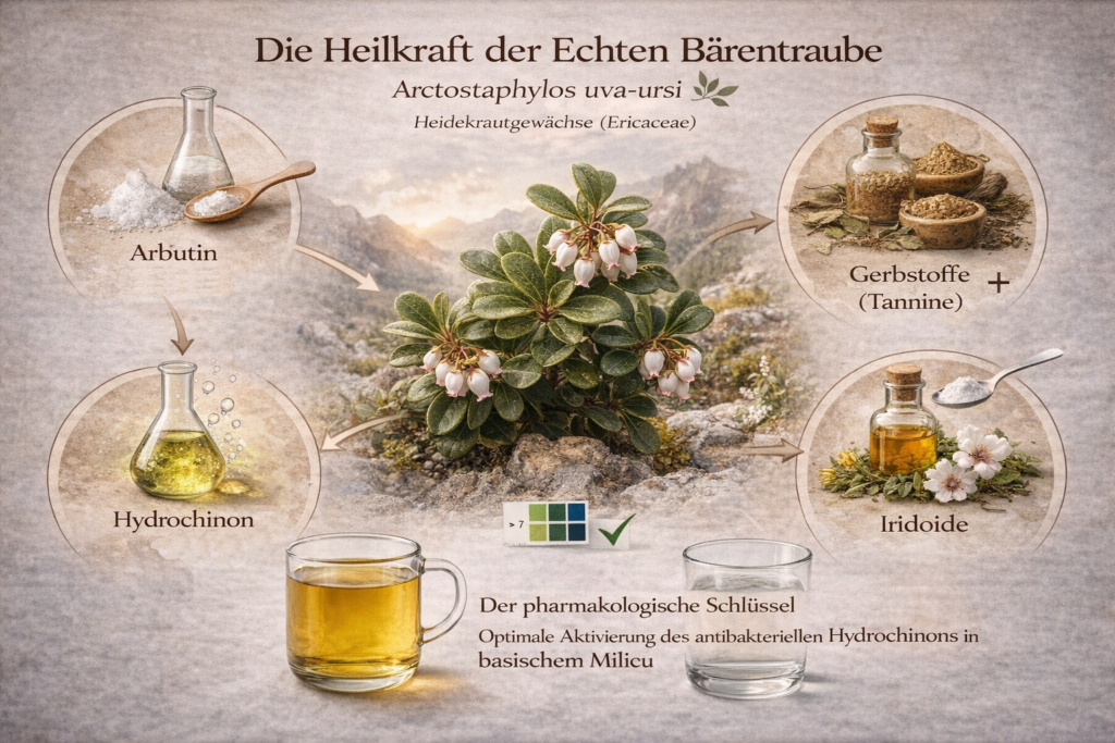 Der pharmakologische Schlüssel: Die Umwandlung von Arbutin in das antibakterielle Hydrochinon erfolgt optimal in einem alkalischen Milieu (pH-Wert > 7). Daher wird in der modernen Phytotherapie oft die gleichzeitige Einnahme von Natron oder eine basenreiche Ernährung empfohlen.