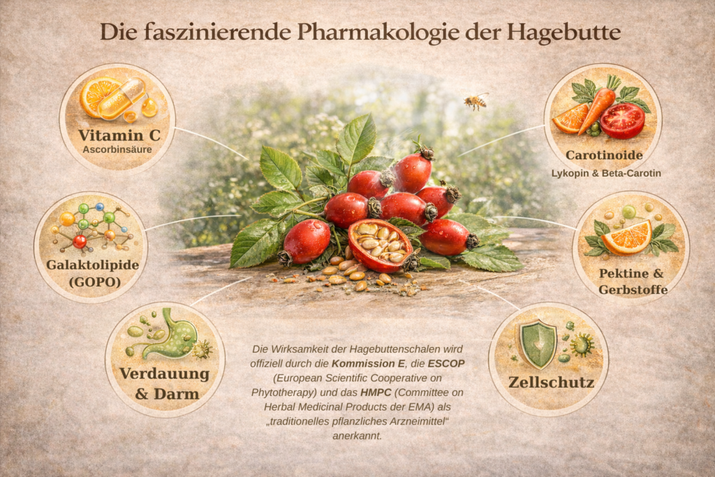 Die Hagebutte ist aus botanischer und pharmakologischer Sicht ein hochkomplexes Gebilde. Als „Scheinfrucht“ der Hundsrose (Rosa canina) aus der Familie der Rosengewächse (Rosaceae) vereint sie eine Vielzahl an bioaktiven Substanzen, die in dieser Konzentration in der Pflanzenwelt selten sind.