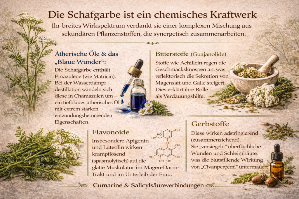 Die Schafgarbe ist ein chemisches Kraftwerk. Ihr breites Wirkspektrum verdankt sie einer komplexen Mischung aus sekundären Pflanzenstoffen, die synergetisch zusammenarbeiten.