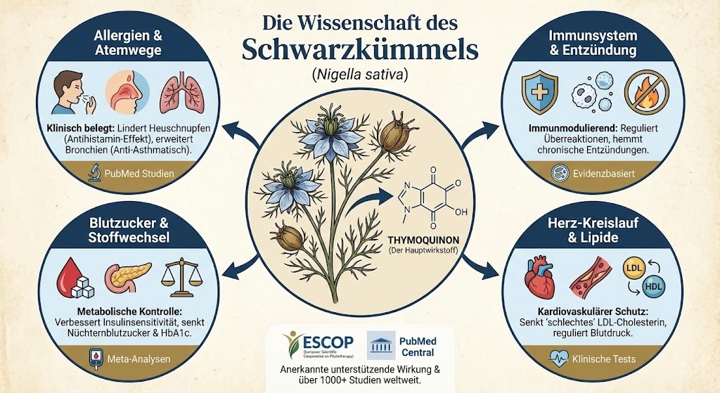 Die Wirksamkeit von Schwarzkümmel ist heute kein bloßes Versprechen der Volksheilkunde mehr. Mit über 1.000 publizierten Studien in internationalen Datenbanken wie PubMed gehört Nigella sativa zu den am besten dokumentierten Heilpflanzen der modernen Phytotherapie.